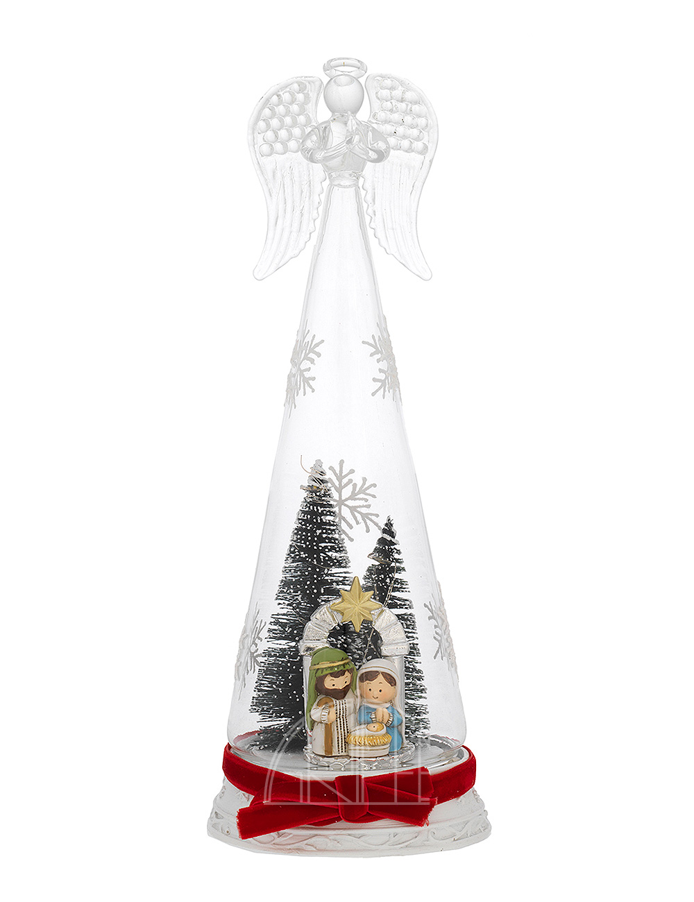 Decorazione Cono Vetro Rappresentante Angelo con Alberi LED Verdi E con Presepe.