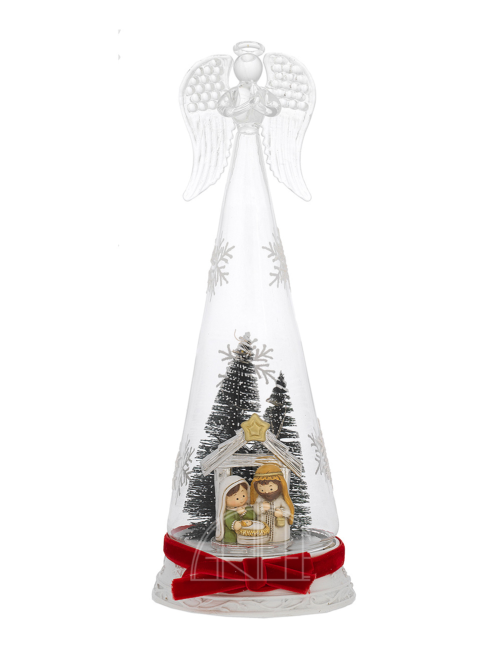 Cono Vetro Angelo con Alberi LED Verdi E con Presepe H.21 Cm