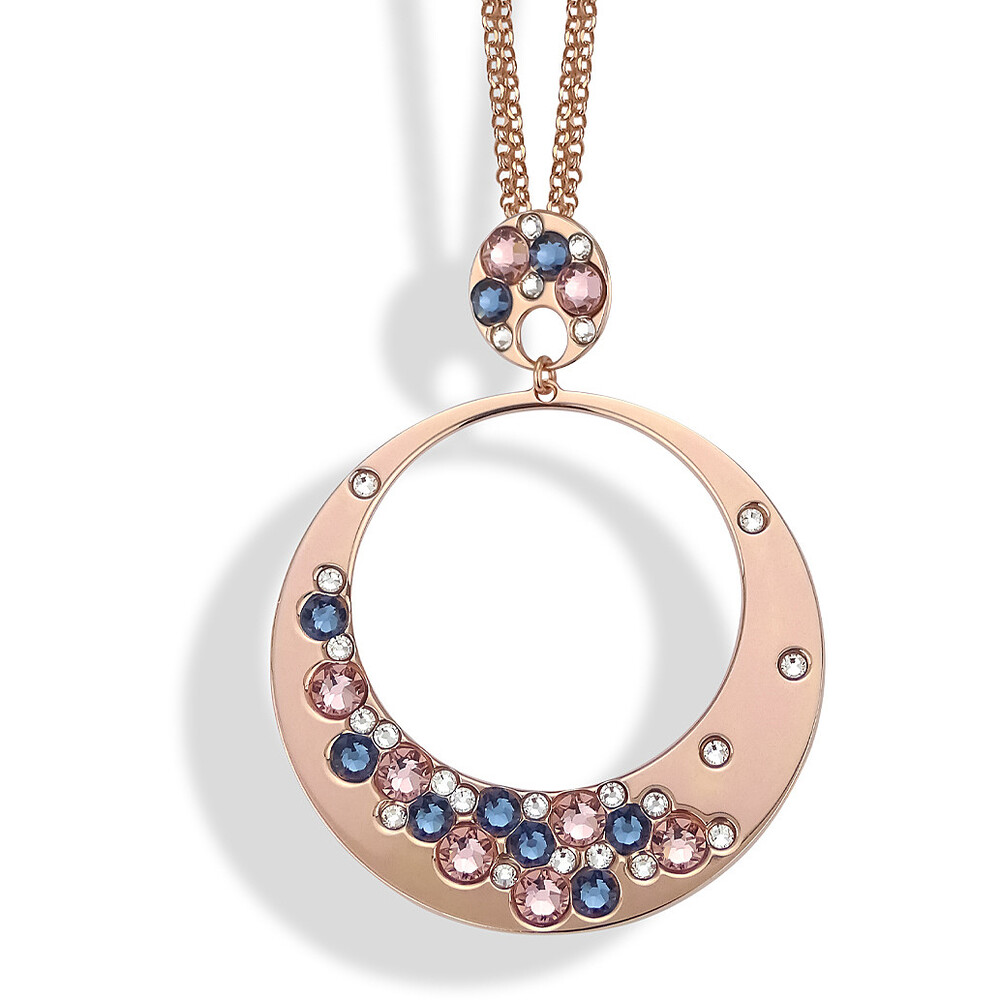 Collana da donna di Boccadamo della linea mediterranea della collezione harem. Collana color oro rosa con pendente grande e cristalli. Collana doppio indosso color oro rosa con pendente grande decorato da cristalli crystal, denim blue e vintage rose. Materiale: bronzo. Produzione: realizzato in italia. Misure: lunghezza 2 fili cm 80, 4 fili cm 40. Dimensione: diametro pendente cm 5, lunghezza cm 6,5. Chiusura: con moschettone. La referenza è xgr655rs