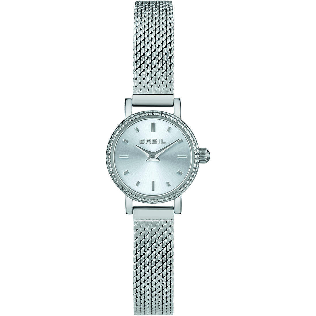 Orologio solo tempo da donna di Breil della collezione darling. Orologio solo tempo con cassa in acciaio lucido di dimensione 18 mm. La lunetta e' zigrinata in acciaio. Il quadrante e' argento con effetto sunray. Gli indici sono applicati di colore argento. Il vetro e' minerale. Il il bracciale e' in acciaio con maglia milanese. La chiusura e' a scorrimento. Movimento: vx00. La resistenza all'acqua e' 3 atm. La referenza è tw1934