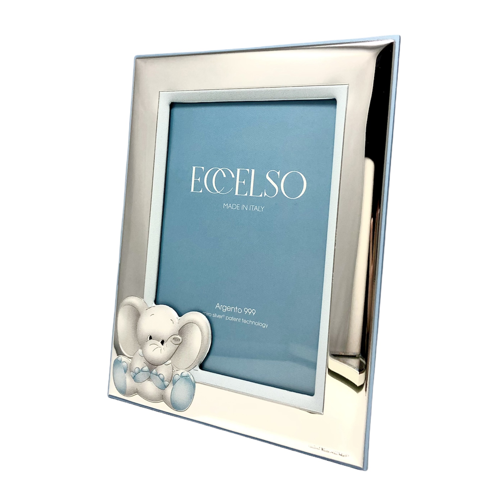 Cornice in Argento 925 per Bimbo con Disegno Elefante, Retro in Legno Celeste. Eccelso 5061/4C.