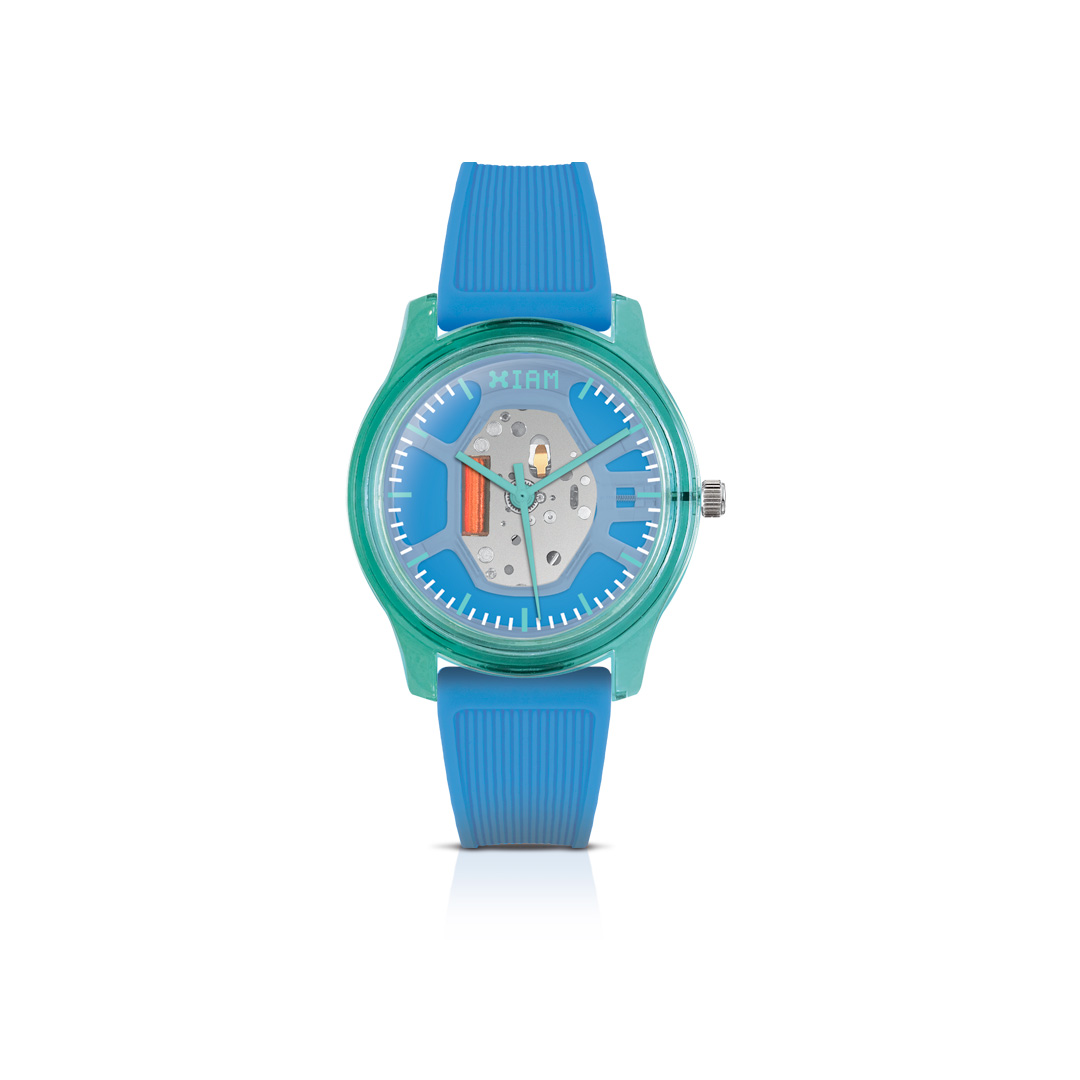 Orologio IAM-345 I AM THE WATCH. Cassa in policarbonato trasparente 40mm. Quadrante con indici e logo stampato. Porta-movimento in ABS. Fondello in acciaio. Movimento Japan Miyota 2035. Water resistant 5 atm. Cinturino in silicone.