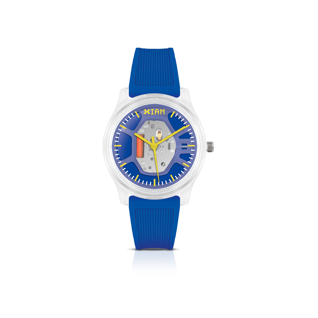 Cassa in policarbonato trasparente 40mm. Quadrante con indici e logo stampato. Porta-movimento in ABS. Fondello in acciaio. Movimento Japan Miyota 2035. Water resistant 5 atm. Cinturino in silicone.