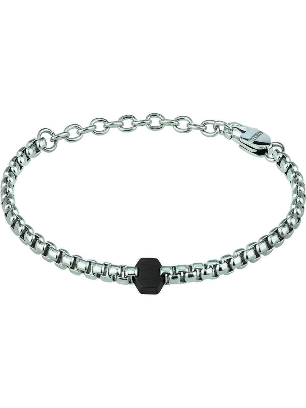 Bracciale da uomo di Breil della collezione kaleido. Bracciale catena in acciaio lucido con iconico elemento centrale esagonale in acciaio con finitura nera satinata. chiusura a moschettone. lunghezza minima: 17cm. lunghezza massima: 22cm. La referenza è tj2992