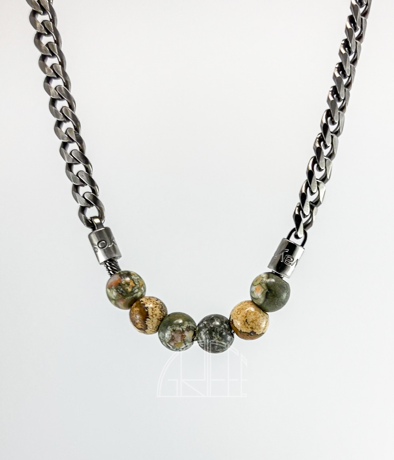 Collana in acciaio con pietre con pietre naturali giada nefrite e paesina.