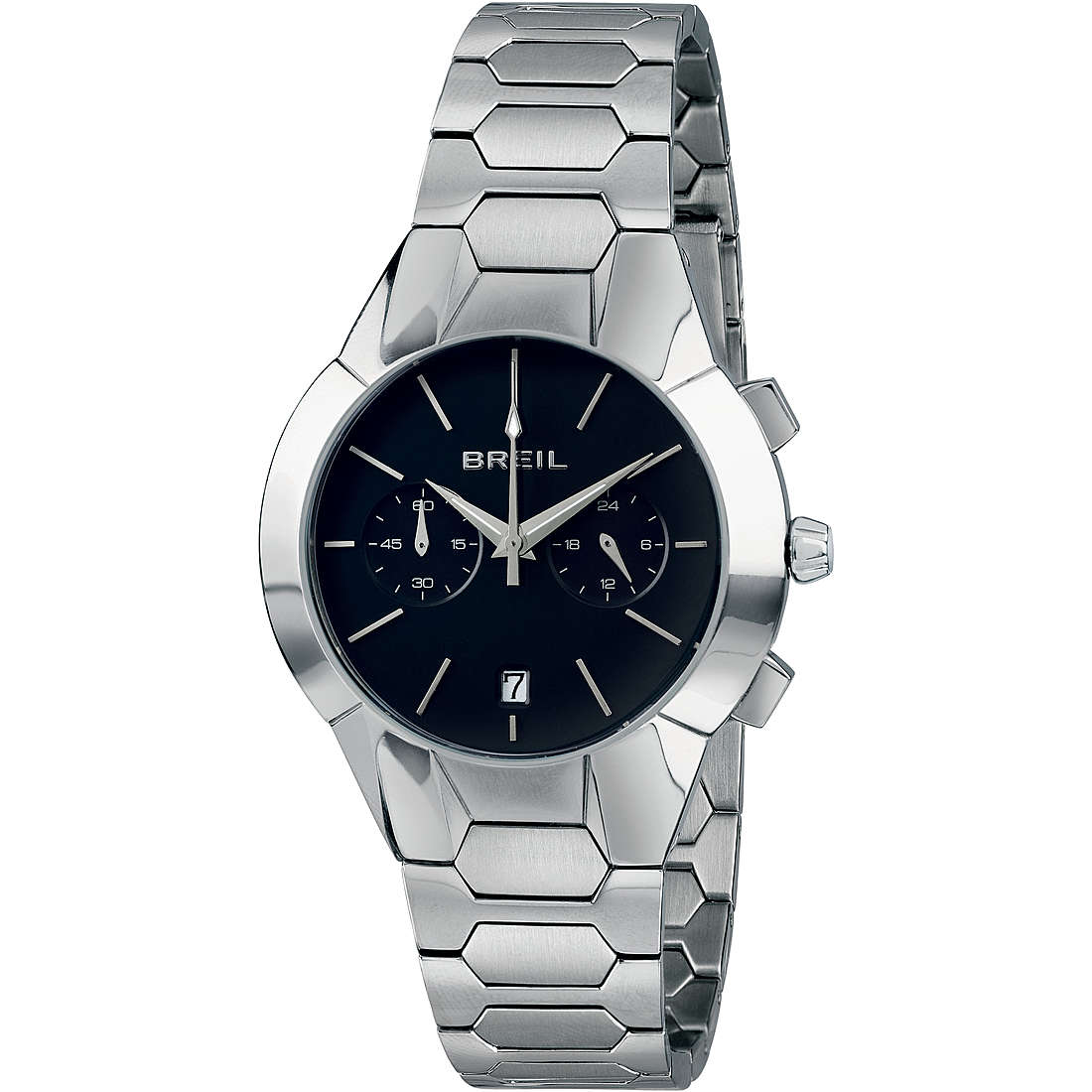 Orologio cronografo da uomo di Breil della collezione new one. Orologio con cassa del diametro di 43mm. Movimento vj20. Resistenza all'acqua di 5 atm. Cassa in acciaio. Lunetta in acciaio con cristalli bianchi. Corona in acciaio lucido. Quadrante nero. Indici con cristalli bianchi. Sfere silver. Vetro minerale. Bracciale in acciaio con maglie con effetto onda. Chiusura con pulsanti. La referenza è tw1847
