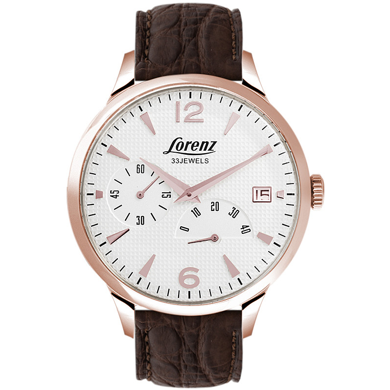 Orologio Solo Tempo Da Uomo Di Lorenz Della Collezione Anniversary. Orologio Realizzato In Acciaio Con Cassa Rotonda E Vetro Esalite Bombato. Orologio Con Cassa Del Diametro Di 42 Mm. Quadrante Di Colore Bianco Arabe Con Indici. Il Cinturino E' Realizzato In Coccodrillo Marrone. Orologio Con Chiusura Ardiglione. Misura Anse: 20 Mm. Lunghezza Cinturino: 11+7 Cm. Resistenza All'Acqua: 5 Atm. Movimento Seagull Ty2530. Funzioni: Tre Sfere, Data E Riserva Di Carica. Orologio Dotato Di Datario. La Referenza È 030160Dd