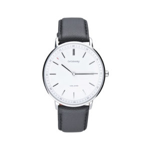 Orologio solo tempo in acciaio 304 con quadrante bianco e cinturino in tessuto nero e interno in pelle naturale color arancione con fibbia in acciaio.